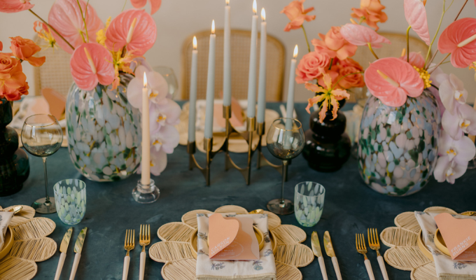 Custom table number stands, pop-up menus, crystal candelabras, and towering floral centrepieces created a harmonious blend of tradition and innovation.